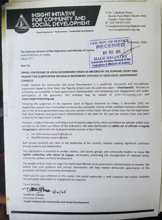Insight Initiative for Community and Social Development (IICSD), a youth-led governance and accountability organisation based in Osogbo, Osun State, has written to the Attorney-General of the Federation and Minister of Justice, Lateef Fagbemi, SAN, seeking the prompt release of withheld local government funds belonging to Osun State in compliance with the recent Supreme Court judgment on full autonomy for councils.